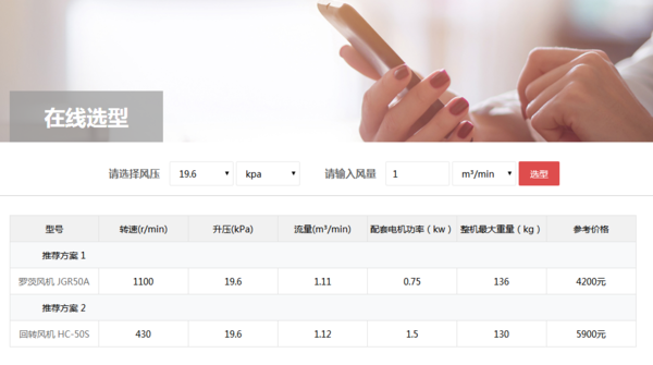 此外,還可以通過風機選型系統查詢回轉風機價格,如下圖客戶僅需輸入風量、選擇風壓,就可以方便、快速、準確、可靠地進行羅茨鼓風機、回轉式鼓風機等各類容積式風機的選型和價格查詢工作。風機選型系統地址:http://m.hzgcy.com/search.php