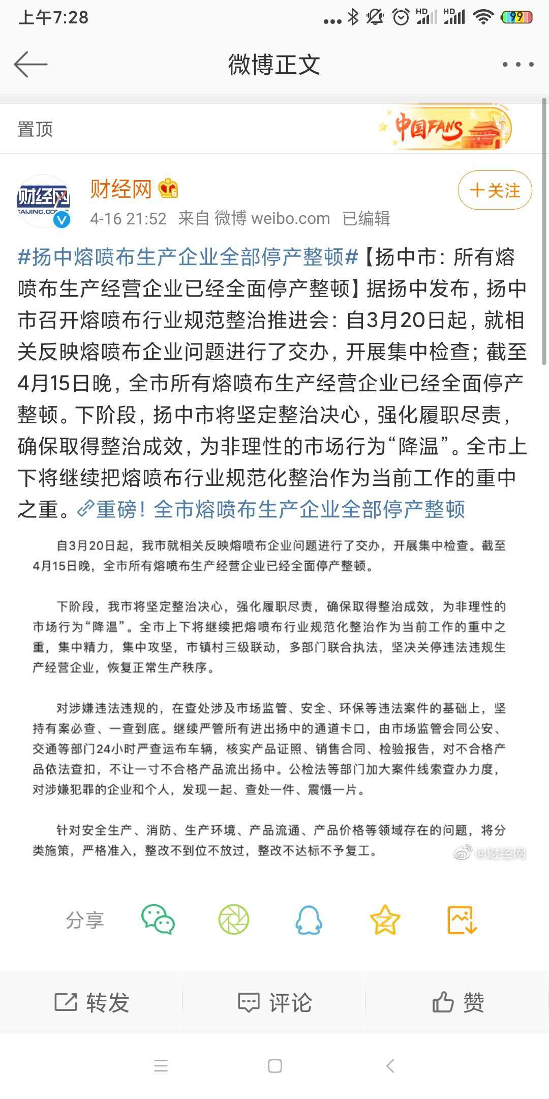 4月15日,經揚中市委、市政府研究決定,在全市范圍內實行熔噴布行業“休克”療法,熔噴布生產企業、個體工商戶一律停產整頓,直至產品符合相關質量標準、生產環境設施滿足安全環保要求,再經審批方可重新開工,對經審查無法整頓到位或不具備生產經營條件的,堅決予以關停、取締。錦工風機從客戶處得知,整頓的消息出來后,個別小作坊已經開始甩賣生產線了,還有的開始向內地轉移生產線,但暴利之下,只能讓市場來調節,整頓產量下來了,可能會出現越整頓越漲價的情況。