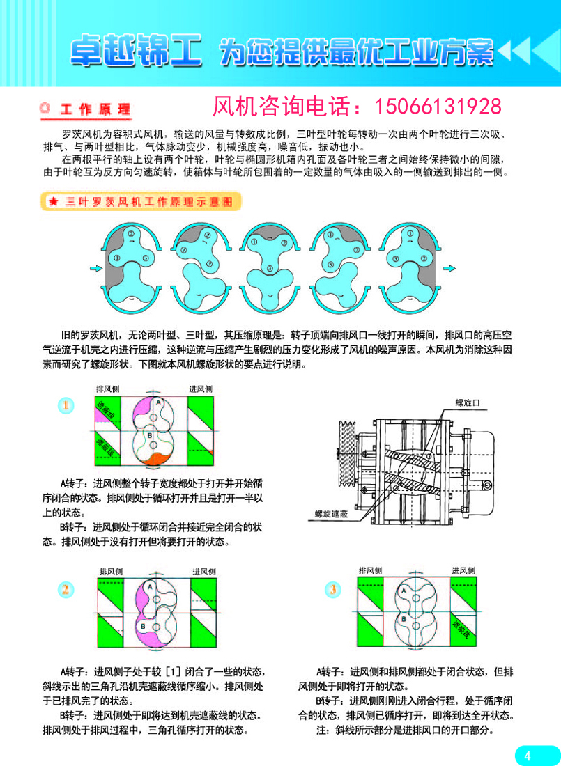 舊的羅茨鼓風機,無論兩葉型、三葉型,轉子頂端向排風口一線打開的瞬間,排風口的高壓空氣逆流于機殼之內進行壓縮,從而產生劇烈的壓力變化,形成了風機的噪音。本風機為消除這種因素而研究了螺旋形狀。詳細了解三葉羅茨風機與兩葉羅茨風機性能對比文章地址:http://m.hzgcy.com/archives/3690