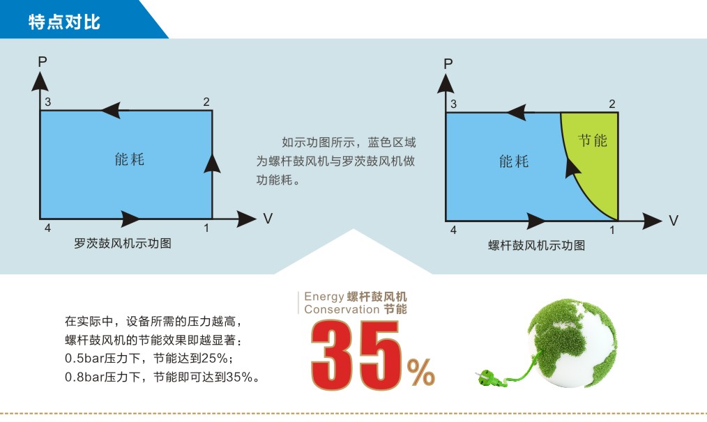 雙螺桿鼓風機是傳統羅茨和螺桿機型的衍伸機型,具有傳統羅茨風機強制送風的特點,螺桿式機型具有一定自壓縮,通過過量吸入達到超高的容積效率,雙螺桿鼓風機采用的內壓縮所需功耗要遠遠低于羅茨鼓風機采用的外壓縮,而且內壓縮過程是連續漸進的,氣流脈動要低于羅茨鼓風機,所以螺桿鼓風機的噪音及穩定性也均優于羅茨鼓風機。不啰嗦了,用圖說話。